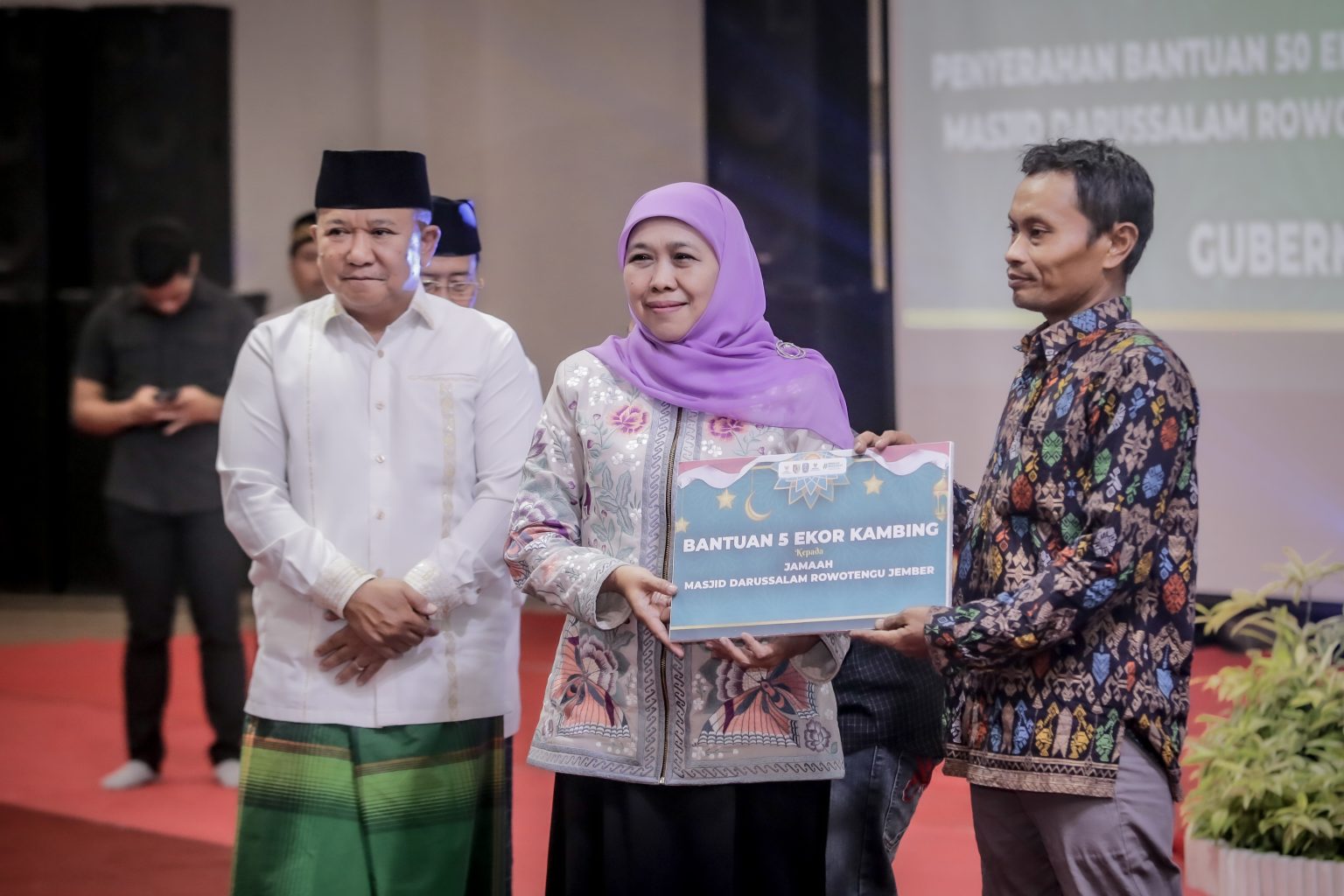 Gubernur Khofifah membagikan bantuan dari Baznas Jawa Timur berupa 700 paket sekolah dan santunan kepada para yatim piatu dan bantuan 50 ekor kambing untuk dikembangbiakkan diberikan kepada 10 orang jemaah Masjid Darussalam Rowotengu, Desa Sidomulyo Kec. Semboro Jember.